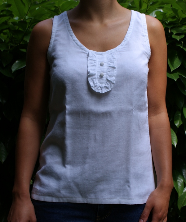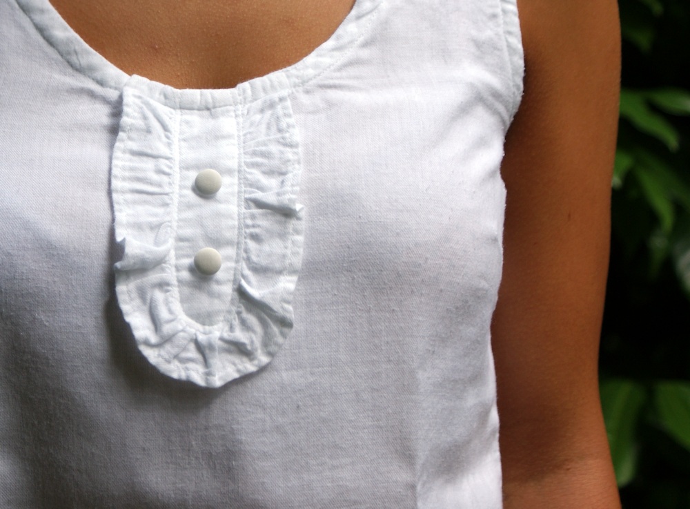 J’avais dans mes stocks de tissu un coton blanc tout fin, de la batiste je pense. Les boutons sont de récup.
