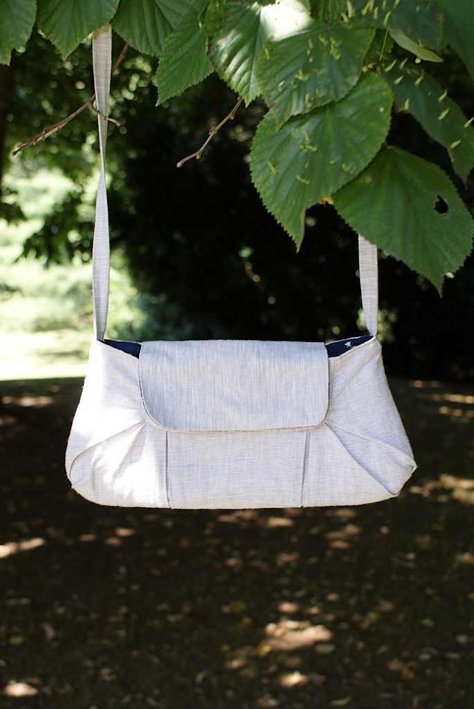 J’ai utilisé un lin beige et un coton bleu marine à petites étoiles blanches pour la doublure.