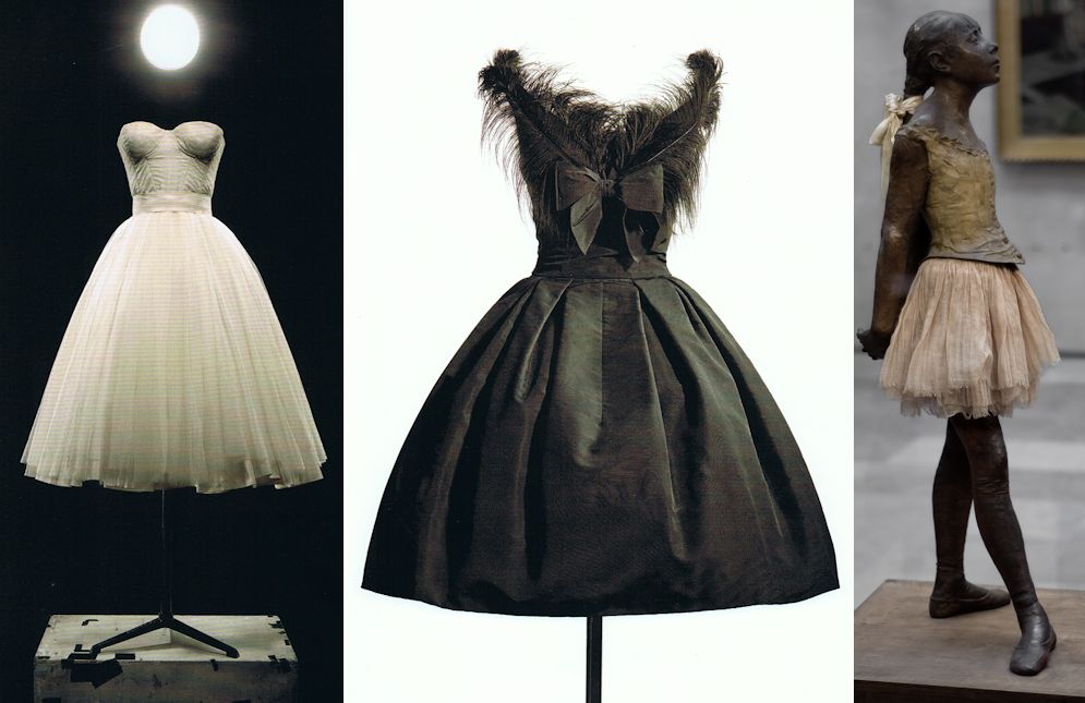 Des créations telles que la robe Cygne noir ou la robe du soir en tulle et satin de soie, issue de la collection prêt-à-porter automne-hiver 2004 par John Galliano, s’inspirent directement du ballet. Ces robes, par leur légèreté, rappellent les tutus des danseuses de Degas aux couleurs poudrées. Les coupes fluides évoquent aussi les robes légères balayées par le vent des Femmes à l’ombrelle de Monet.