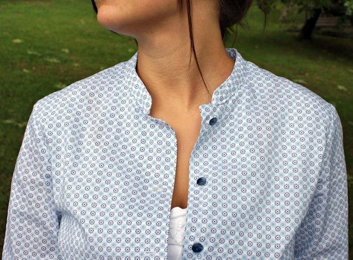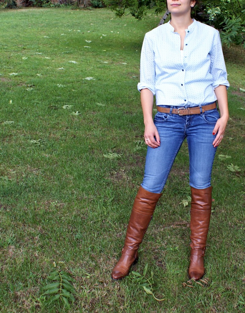 Pour commencer, cette petite chemise en coton que j’ai cousue, pleine d’espoir. Je m’imaginais la porter rentrée dans un jeans, avec des bottes de chasseur, pour une petite balade automnale, mains dans les poches, profitant ainsi des derniers rayons du soleil qui réchauffent l’air déjà un peu frais…