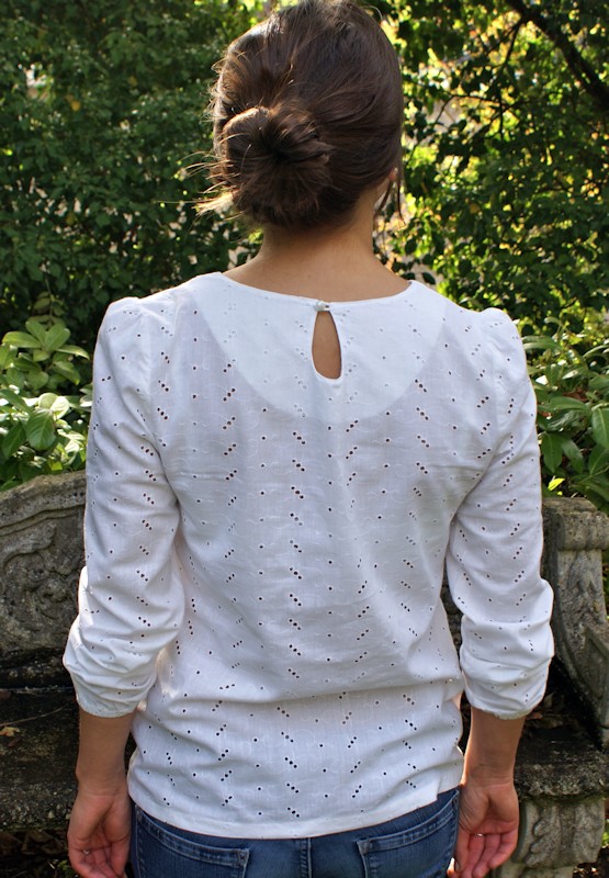 Le modèle est tout simple, et en même temps comprend de jolis détails qui donnent une touche d’originalité : épaules légèrement bouffantes, petits plis sur le devant, jolie découpe en forme de goutte dans le dos.