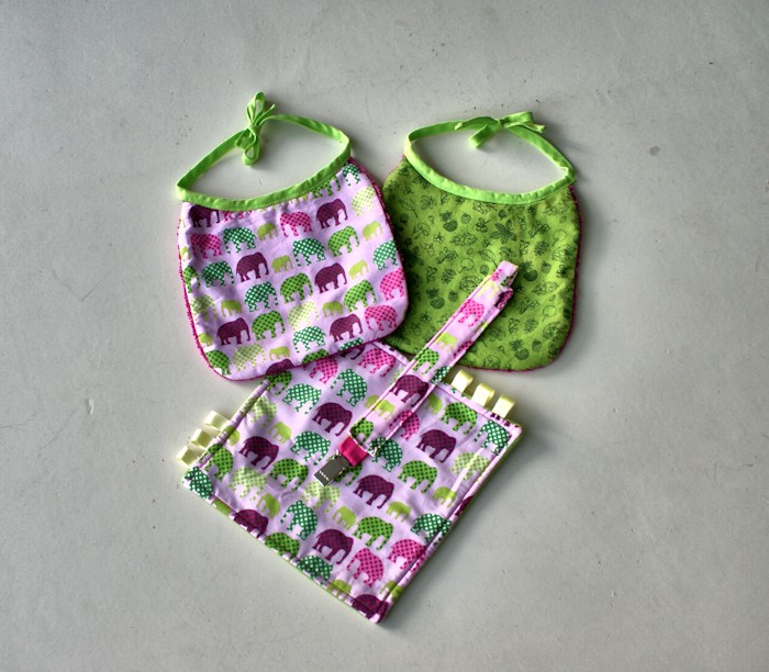Il y a quelques semaines, j’ai cousu ce trousseau pour bébé lors d’un atelier organisé chez les Cousettes à Namur. Deux petits bavoirs, un doudou et un porte-tétine.