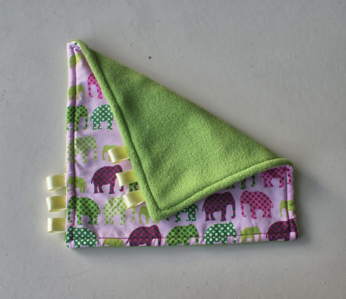Pour le doudou : un côté en polaire, un côté en joli coton imprimé, et des petits rubans à saisir pour éveiller les sens. Le tout assorti aux couleurs de sa chambre. Ça s’appelle le souci du détail 🙂