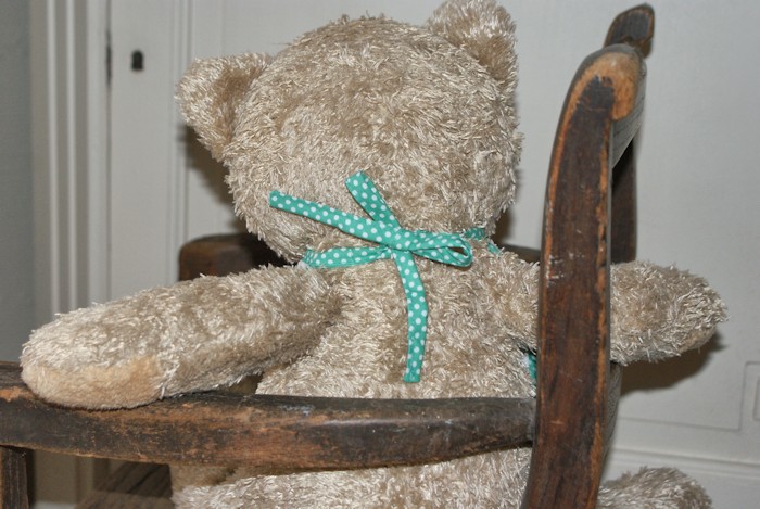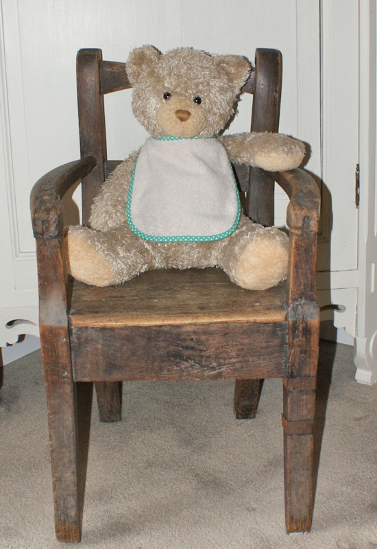 Nounours est un sacré modeux : il préfère arborer fièrement le plus joli côté de son bavoir, celui avec les petites étoiles. Et puis c’est un grand garçon, il est déjà bien loin dans le vingtaine (pour ne pas dire qu’il se rapproche dangereusement de la trentaine) et il mange proprement depuis longtemps. J’ai donc dû le payer fort cher pour qu’il accepte de se montrer à vous avec l’autre côté du bavoir, celui qui est moins joli mais bien plus fonctionnel pour essuyer la petite boubouche baveuse.
