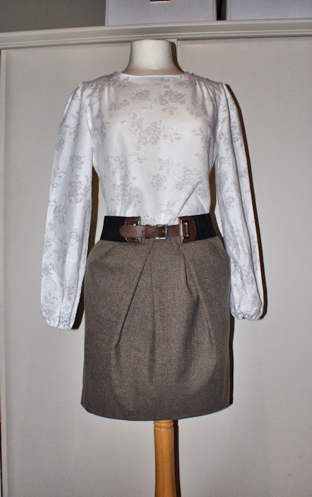 Il y a quelques jours, je vous ai montré cette blouse, la première pièce d’une tenue que je vais porter pour un mariage. Il me restait à coudre une jupe pour éviter l’effet « fesses à l’air » (mauvais genre) et une cape pour éviter l’effet « ah glagla quelle idée de se marier en décembre ! »