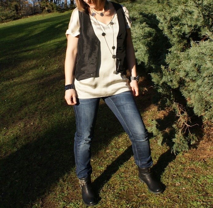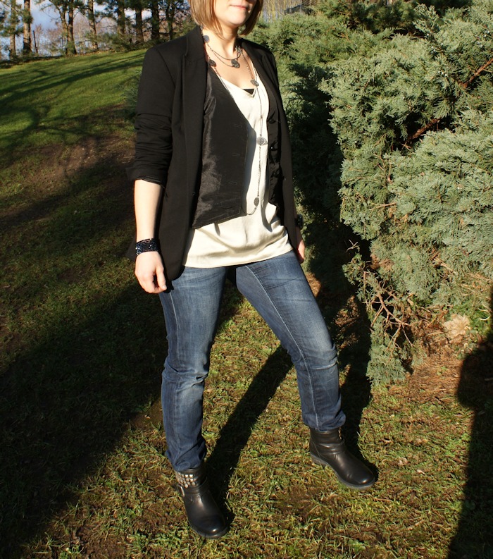 Le reste de la tenue n’est pas mon oeuvre, non non ! Il s’agit d’éléments puisés avec soin et minutie par ma soeur dans son dressing bien fourni. Elle m’a avoué avoir passé un certain temps, je dirais même plus un temps certain, pour choisir LA tenue qui ferait mouche. Elle risque de m’en vouloir un tout petit peu d’avoir vendu la mèche 🙂