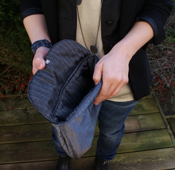 Une pochette ellipse (patron ici, première version ici) est venue tenir compagnie au petit gilet qui se sentait bien seul. Le rabat a été fait dans une chute dudit gilet, le corps de la pochette dans de la soie grise et la doublure dans un reste de tissu « papy ».