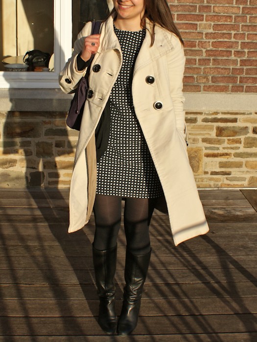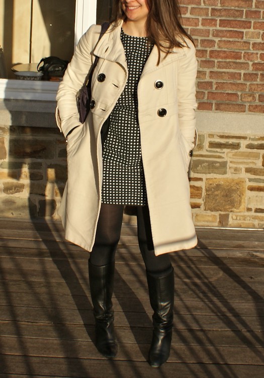 Robe Harlequin home-made, manteau Mango d’il y a au moins 5 ou 6 saisons, bottes noires en cuir Zara d’à peu près la même époque (je suis terriblement conservatrice), gilet noir Zara (pas très visible sur la photo) d’il y a 3 ou 4 saisons (hou le jeunot!!!)