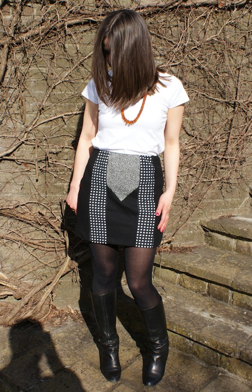 Pour rendre la tenue plus compatible avec ma palette de couleurs (palette automne), j’ai accessoirisé avec un collier ambré (vintage, hérité de ma mamy), un trench beige (zara, trèèèèèèèèèèèès ancienne collection), des bottes chamois (??? couleur indéfinissalbe, mais « chamois » je trouve ça joli), un sac kaki et un foulard doré (tenue portée ce mardi pour aller travailler).