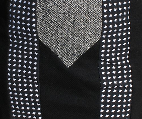 Le tissu noir à motifs blancs, vous le connaissez déjà. C’est un reste de ma robe Harlequin. L’empiècement du devant a été découpé dans un lainage trouvé au marché du tissu à Namur. Le lainage noir provient des Tissus du Chien Vert.