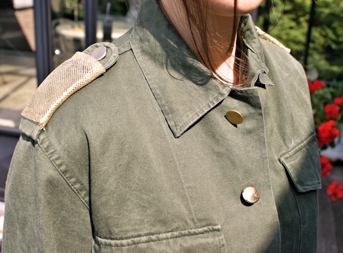 Histoire de glamouriser tout ça tout en restant dans la palette automne (non mais sérieux, si je mets un pieds dans une caserne, ils vont me lancer des cailloux), j’ai remplacé les boutons verts par de jolis boutons dorés chinés en brocante. Ceux des épaules sont en métal brossé… Le souci du détail !