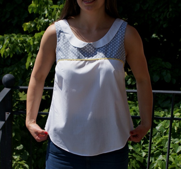 Cette fois-ci, j’ai opté pour une association de couleurs que j’adore, le trio blanc-gris-jaune. Les cotons sont des restes de deux autres projets (la doublure de ceci et cette petite jupe). Le passepoil et les boutons viennent de chez Veritas dans la collection Sew-Be-Do.
