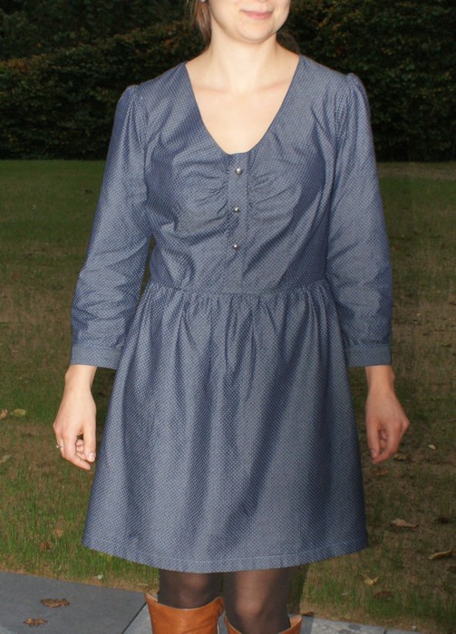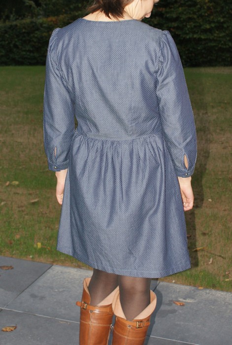 Après de nombreuses hésitations, alors que je n’y pensais plus, je suis tombée par hasard sur le tissu parfait lors d’un petit passage dans la boutique Au Grez de mes envies… (super boutique située à Grez-Doiceau, je vous en reparlerai…) Un magnifique chambray à petits pois à 5 € le mètre (fin de série, j’en ai pris 2 mètres… j’aurais dû en prendre 5, ou même 10).