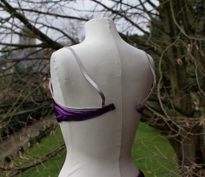 Le satin est un reste de ma nuisette, acheté dans une petite boutique de la Rue de Brabant à Bruxelles. Normalement, la ganse doit être coupée dans un deuxième satin à partir de pièces de patron. Comme je n’avais que du satin orange sous la main, j’ai préféré éviter une association des plus douteuses avec le mauve et je me suis dès lors rabattue sur le plan B en utilisant du biais satiné gris clair. Moins audacieux, mais plus prudent !