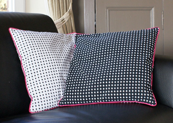 Ras-le-bol de mes vieilles housses de coussin délavées et moches. Tellement moches que je n’ai même pas pris la peine de les photographier pour vous montrer l’avant-après.