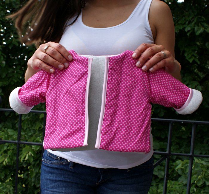 J’ai réalisé cette petite veste réversible à partir du patron gratuit de France Duval Stalla. Impossible de retrouver le lien sur son blog (bizarre, ça marchait encore il y a quelques semaines ; je ne manquerai pas d’éditer ce post si ça fonctionne à nouveau). J’ai utilisé du polaire blanc que j’ai matelassé sur une couche de ouatine par des piqûres verticales, un coton rose à pois pour la doublure et un biais satiné rose pale pour les finitions.