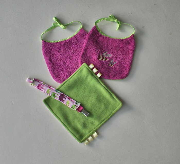 Il y a quelques semaines, j’ai cousu ce trousseau pour bébé lors d’un atelier organisé chez les Cousettes à Namur. Deux petits bavoirs, un doudou et un porte-tétine.