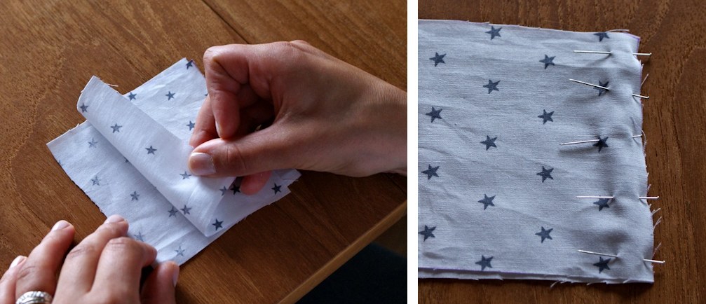 Pour commencer, disposez les pièces de tissu à assembler envers contre envers. Epinglez perpendiculairement au bord.