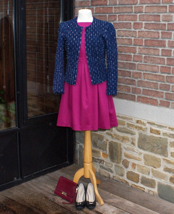 Comme je n’aime pas l’idée de coudre un vêtement uniquement pour une occasion, j’avais envie de quelque chose que je pourrais reporter dans d’autres circonstances. J’ai donc jeté mon dévolu sur la robe June du magazine La Maison Victor (n°3). Et comme en octobre en Belgique il peut faire assez froid, j’ai cousu une petite veste pour compléter la tenue. Il s’agit du modèle H du livre Dressing Chic.